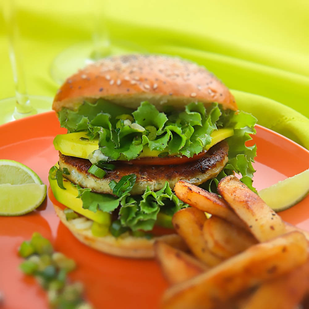 Mettre une cuillère de sauce antillaise sur la base du pain à burger, puis y déposer 2 rondelles de tomate, de l’avocat et une feuille de salade